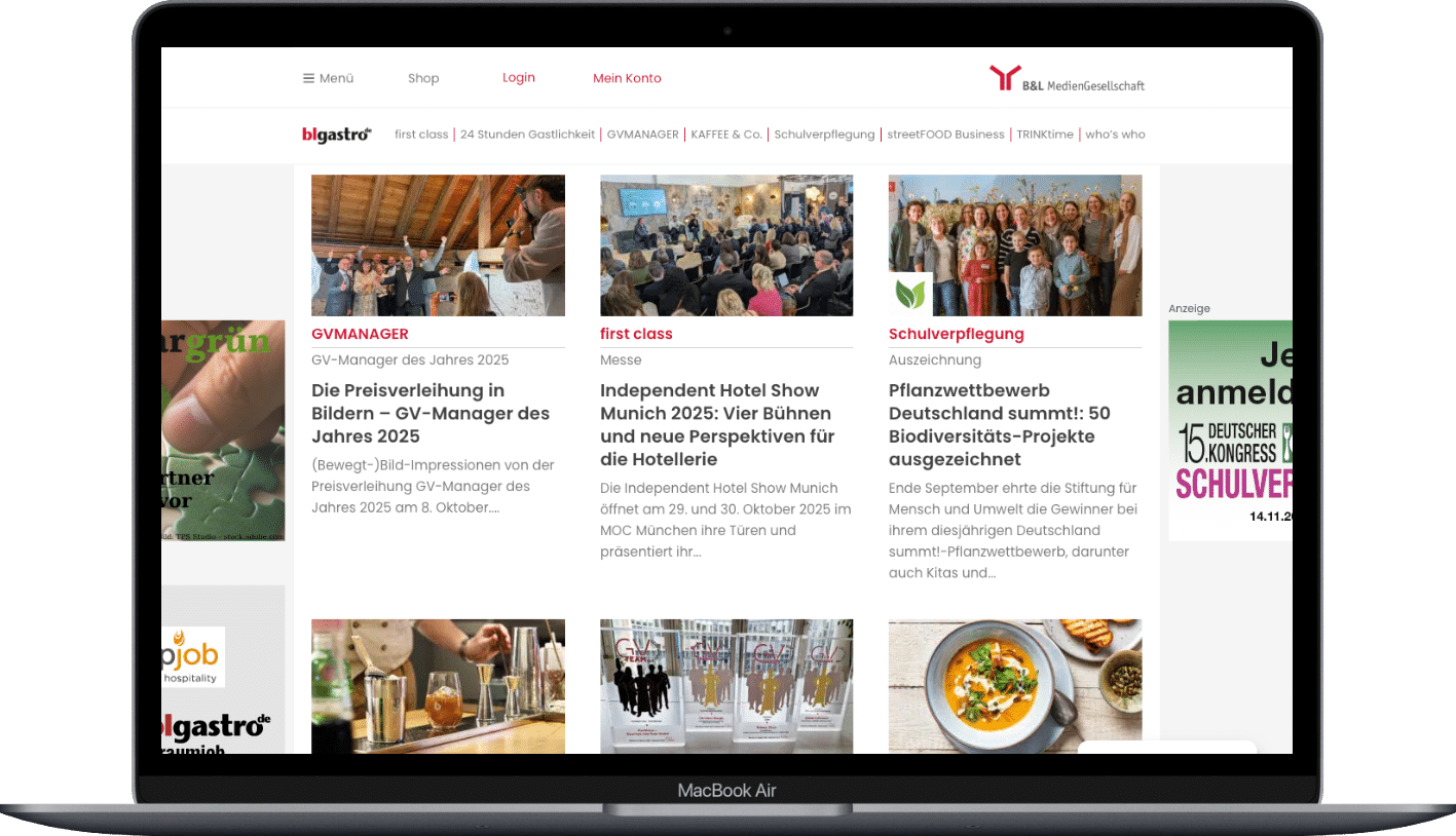 blgastro.de ist die Fachplattform für den HoReCa- und Außer-Haus-Markt. Statt Nachrichtenflut: maßgeschneiderte Marktinfos, anwendungsnahe Berichte, Best Practices und Trends für erfolgreiche Unternehmensführung. Responsiv auf allen Endgeräten. Newsletter erscheinen zweimal wöchentlich, plus Sondernewsletter. Vielfältige Werbeformate für zielgenaue Reichweite.