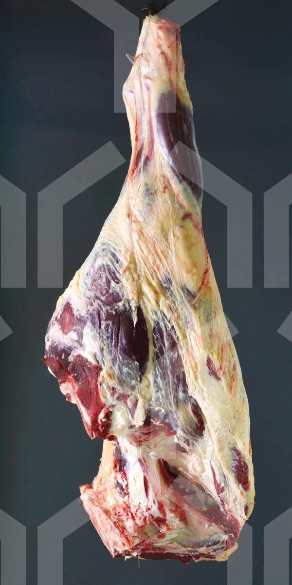 | Bildbeschreibung | Bild von Hinterkeule vom Rind, roh, hängend, vor grauem Hintergrund |