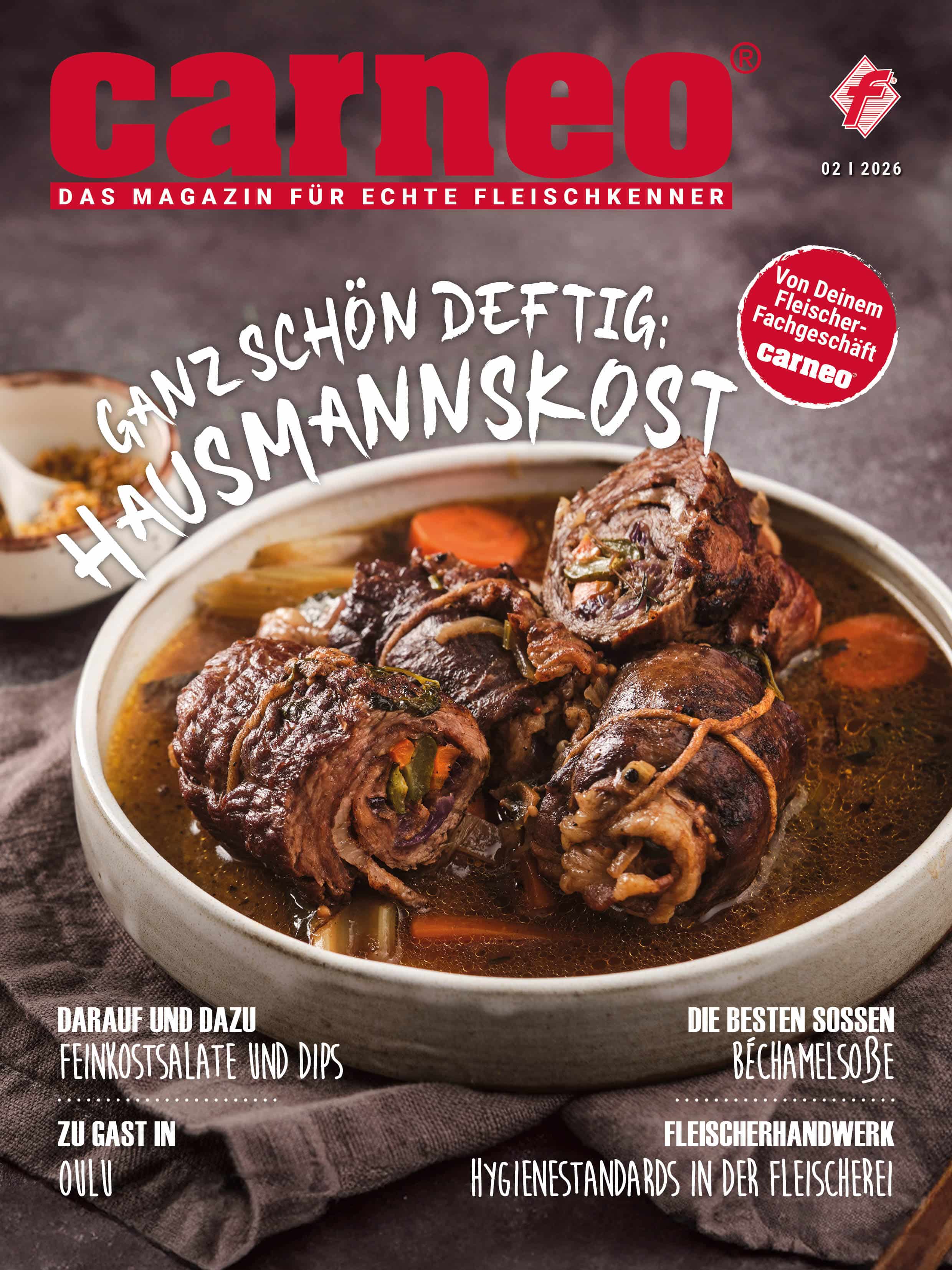 Die neue carneo-Ausgabe für Februar liefert Dir köstliche Inspirationen für die kalte Jahreszeit: Deftige Hausmannskost wie Rouladen, Linseneintopf, Schnitzel und Käsespätzle wärmen Herz und Seele und bringen vertraute Genussmomente auf den Tisch. Ein kulinarischer Abstecher führt uns nach Oulu in Finnland: Während dort eine Rentierpfanne standardmäßig auf dem Speiseplan steht, kochen wir sie in Deutschland mit Hirschfleisch nach. Frische Feinkostsalate und kreative Dips findest Du auf den Seiten 16 bis 19 – ideal für Frühstück, Mittag- oder Abendessen. Auf Seite 13 erfährst Du, wie Du Deine Schuhe nach langen Wintertagen optimal pflegst. Zudem zeigen wir auf den Seiten 24–25, wie wichtig die strikte Einhaltung von Hygiene im Fleischerhandwerk wirklich ist. Dazu zahlreiche schnelle Feierabend-Gerichte, saisonale Kochideen und Soßentipps. Lies jetzt carneo, wenn Du Fleischqualität, Tradition und Genuss zu schätzen weißt.
