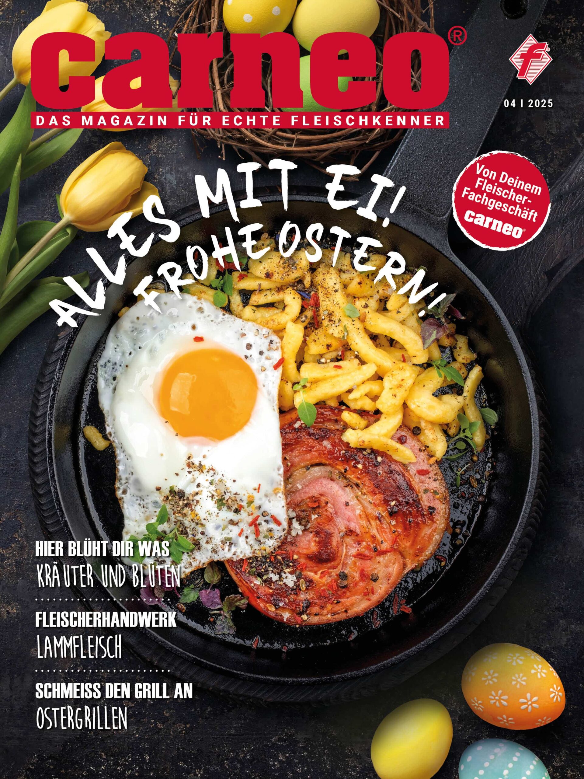 Wir haben die Eier nicht versteckt, sondern ganz prominent serviert: in der April-Ausgabe von carneo findest du tolle Rezepte mit den kleinen Nährstoffbomben. Die schmecken nicht nur zur Osterzeit! Wer allerdings doch lieber auf Eiersuche gehen möchte, findet auf der Seite 21 ein paar Tricks, um das Verstecken und Finden noch etwas spannender zu gestalten. Ein traditionelles Ostergericht ist Lamm – unsere Fleischermeisterin Anja erzählt alles Wissenswerte dazu (S. 24–25). Inspiration für ein deftiges Ostergrillen gibt es auf den Seiten danach. In diesem Heft machen wir außerdem einen kulinarischen Ausflug in die Auvergne, eine der schönsten Regionen Frankreichs. Jetzt, wo der Frühling so richtig startet, sprießt und blüht es auch in Deutschland überall. Auf den Seiten 16–19 schlemmen wir uns einmal quer durch den Kräuter- und Blütengarten, was neben den spannenden Geschmackserlebnissen auch ein echter Genuss für die Augen ist. Speziell auf Salbei gehen wir auf den Seiten 22–23 noch einmal ein, der nicht nur als Heilkraut, sondern auch in der Küche glänzt. Wir wünschen tolle Ostertage und ganz viel Spaß beim Lesen, Kochen und Genießen!