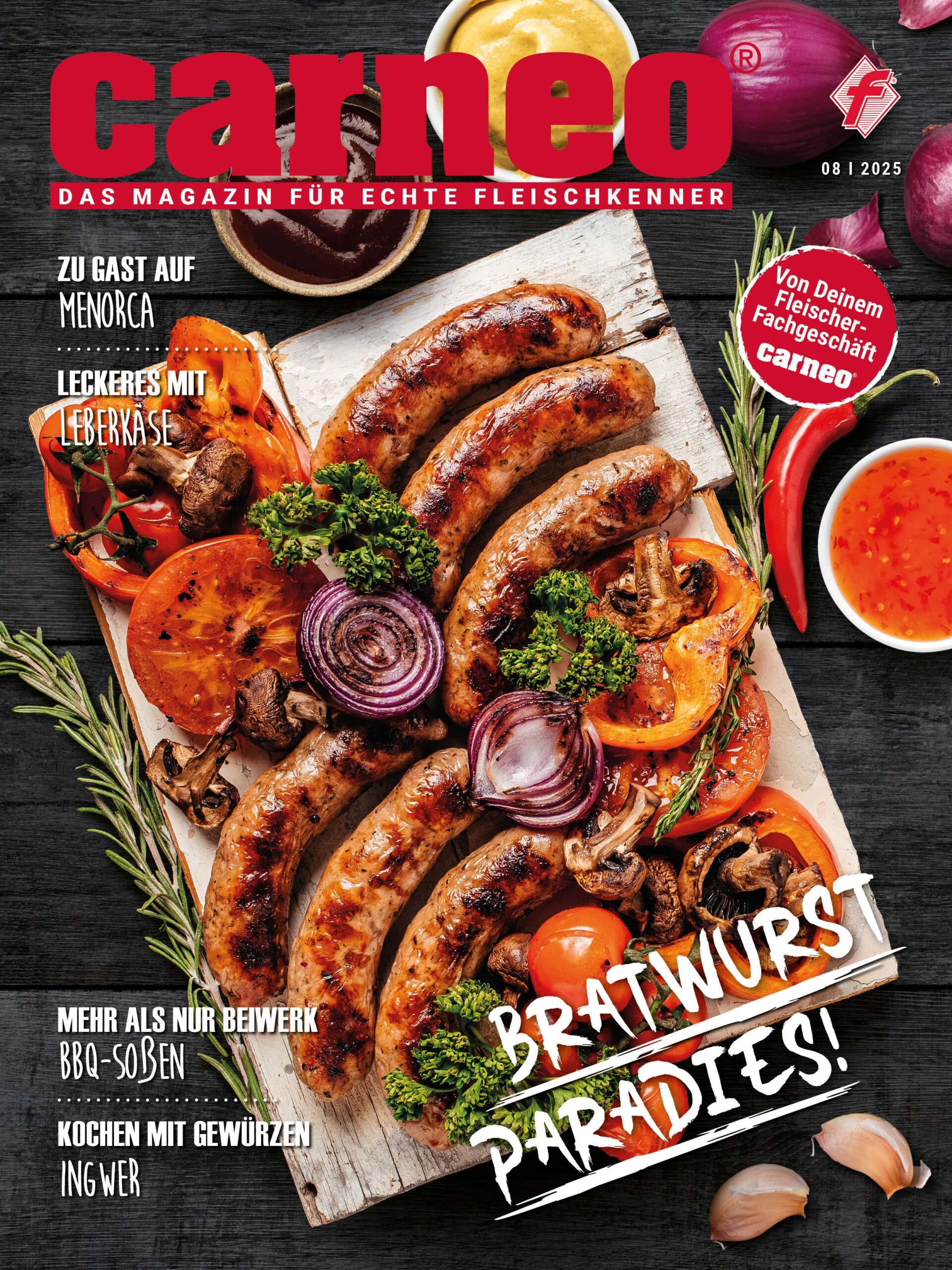 Die Bratwurst gehört so sehr zum Grillsommer, dass wir manchmal fast vergessen, sie angemessen zu würdigen. Das wollen wir in der August-Ausgabe der carneo ausgiebig nachholen, denn Bratwurst ist so viel mehr als nur ein schneller Snack. Sie schmeckt nach Heimat und nach Kindheit. Frisch vom Grill, außen knusprig mit einem Hauch von Rauch, innen saftig und würzig – an manchen Tagen ist das alles, was wir brauchen. Na gut, vielleicht noch eine richtig gute Soße dazu? Deshalb haben wir auch paar köstliche BBQ-Soßen-Varianten wir für dich zusammengestellt. Also komm mit uns ins Bratwurst-Paradies! Danach reisen wir gleich weiter nach Menorca – Mallorcas Schwester-Insel ist mit ihren türkisfarbenen Buchten und den duftenden Pinienwäldern ebenfalls ziemlich paradiesisch. Und dann geht es gleich schön rustikal weiter: Wir kochen mit Leber- bzw. Fleischkäse – das handwerkliche Fachwissen dazu gibt es von unserer Fleischermeisterin Anja. Du merkst, wir wollen die Rezepte in dieser Ausgabe möglichst schnell und einfach halten, damit du weniger Zeit in der Küche und mehr Zeit in der Sonne verbringen kannst. Wir wünschen dir viel Spaß beim Grillen, Kochen und Braten und einen paradiesischen August!