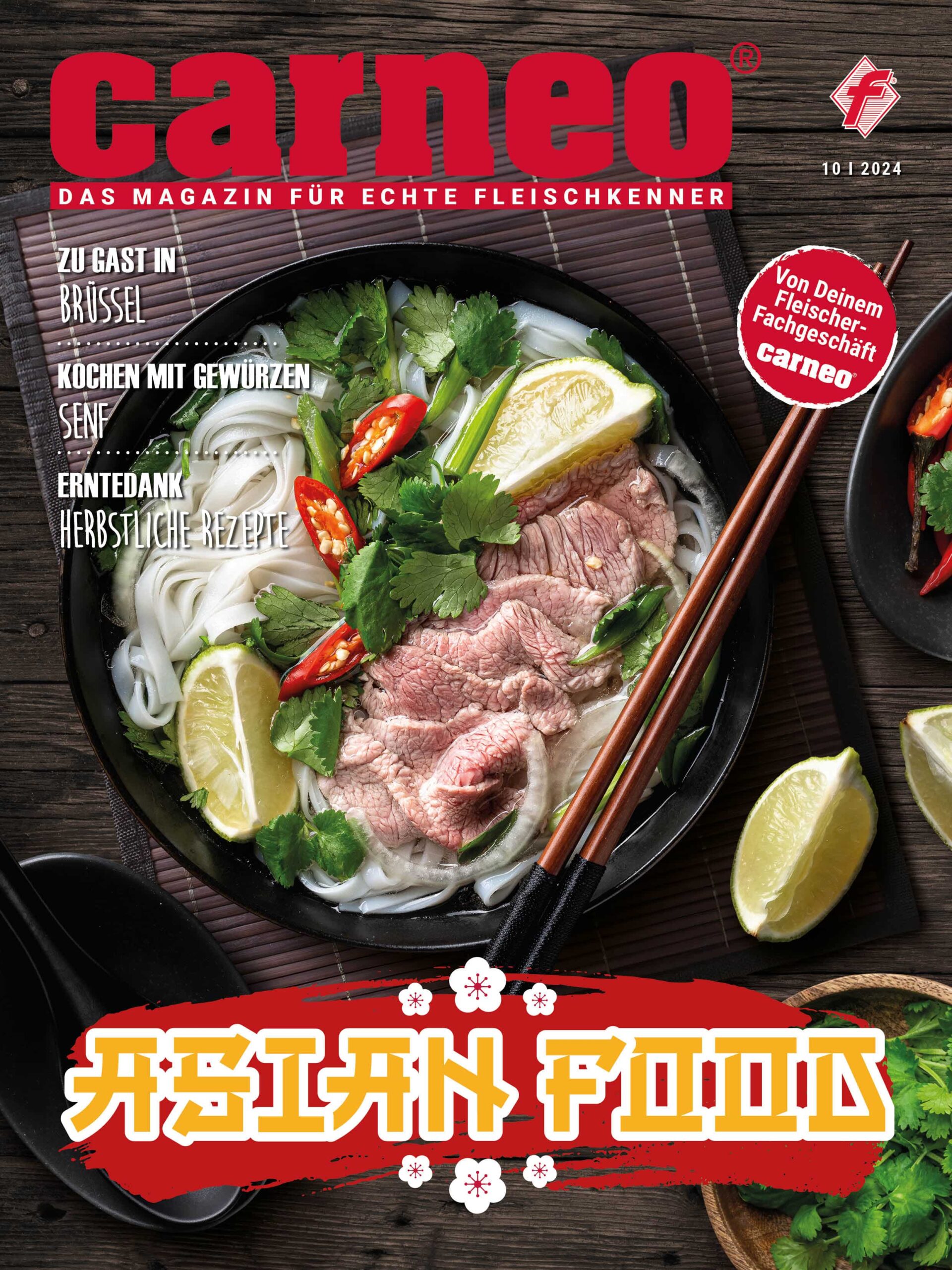 Komm mit auf eine kleine Asienreise! In der Oktober-Ausgabe von carneo haben wir unsere liebsten Rezepte aus Japan, China, Korea, Vietnam, Thailand und Indonesien zusammengestellt. Neben zartem Fleisch und frischem Gemüse bieten diese Gerichte ganz viel „umami“, der Begriff stammt aus dem Japanischen und beschreibt einen tiefen, herzhaften, oftmals fleischigen Geschmack. Dieser steckt in zum Beispiel in Sojasoße, Fleisch oder Pilzen. In jedem Fall sorgt die Kombination aus Geschmack und Frische dafür, dass wir uns nach diesen Gerichten alle Finger lecken! Ein großes Thema im Oktober und damit auch in diesem Heft ist Erntedank, auf den Seiten 16–19 kochen wir mit erntefrischen Zutaten und genießen die Fülle auf dem Tisch. Falls es bei dir einen Truthahn wie beim amerikanischen Thanksgiving geben sollte, bietet unser Sandwich des Monats eine tolle Idee für Restverwertung. Ein Ausflug nach Brüssel steht ebenfalls auf dem Programm; neben Waffeln, Fritten und Schokolade gehört auch ein köstliches Bier-Gulasch zu den landestypischen Spezialitäten. Wenn du gerne deinen Senf dazugibst, sind die Seiten 22–23 bestimmt etwas für dich, denn Senf ist dieses Mal unser Gewürz des Monats. Unsere Kollegin und Fleischermeisterin Anja erzählt in dieser Ausgabe etwas über Innereien und warum man keine Scheu vor deren Zubereitung haben sollte. Wir wünschen dir einen tollen Oktober und ganz viel Spaß beim Lesen & Genießen!